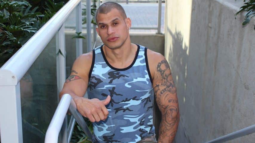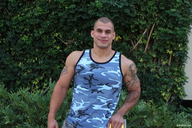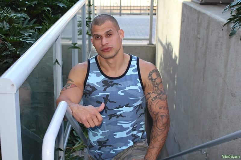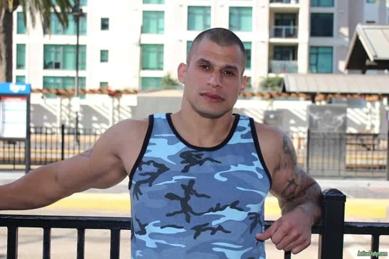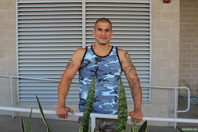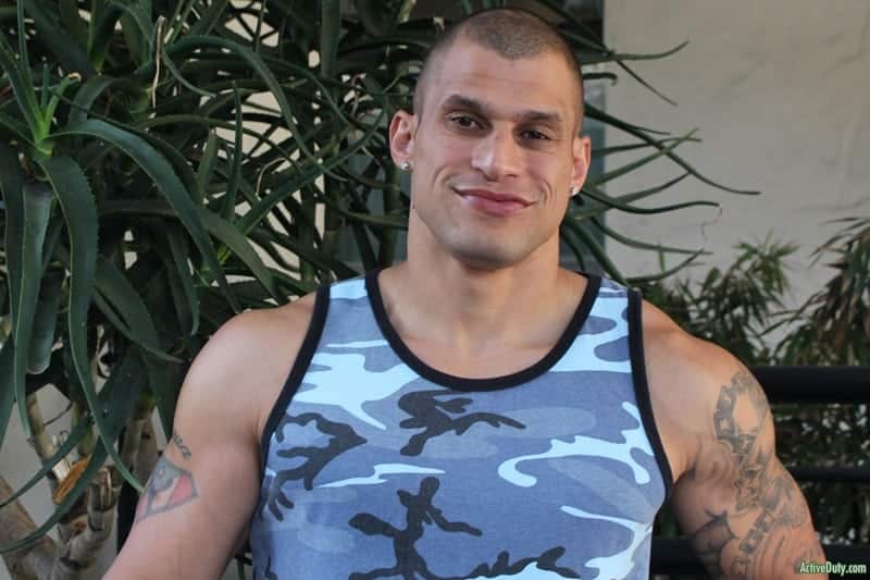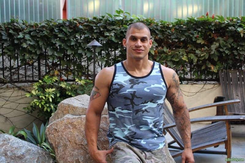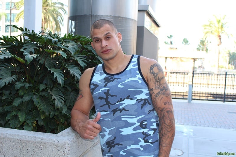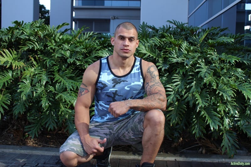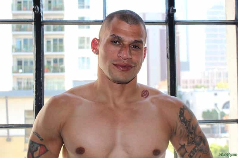 Active Duty says: Once the opening interview is finished Rico stands up and reveals his sexy body by taking all his clothes off. His big long uncut cock flops right out and he sits on the couch and begins working his cock up.
