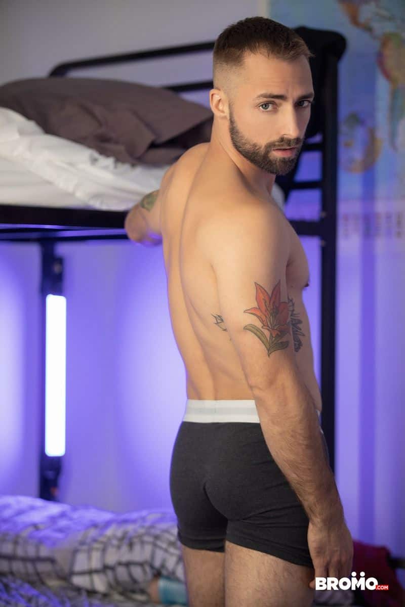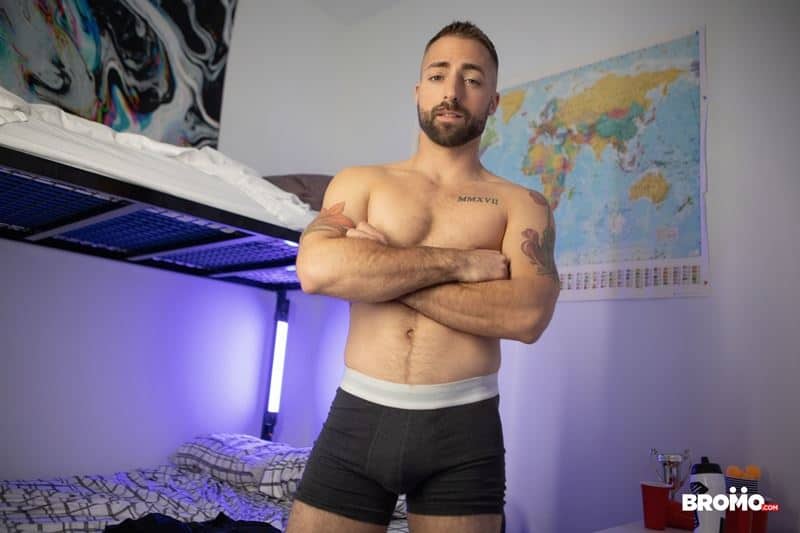 All this man wank action turns Jeremy on and he can’t help but watch and listen before he jumps down from his bunk to surprise Trent catching him as he masturbates.