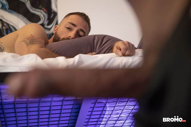 Bromo says: Hot black stud Trent King arrives back to find his roommate bearded hunk Jeremy London fast asleep on his upper bunk.