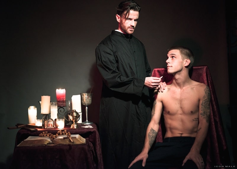 Pulling off his shirt, Brendan fumbles with the boy’s necktie before kissing again. Stripping the young student of his shirt, he tongues his nipples. Taking the ex-priest’s veiny dick into his mouth, Trent sucks as the engorged, stiff-as-a-board member.